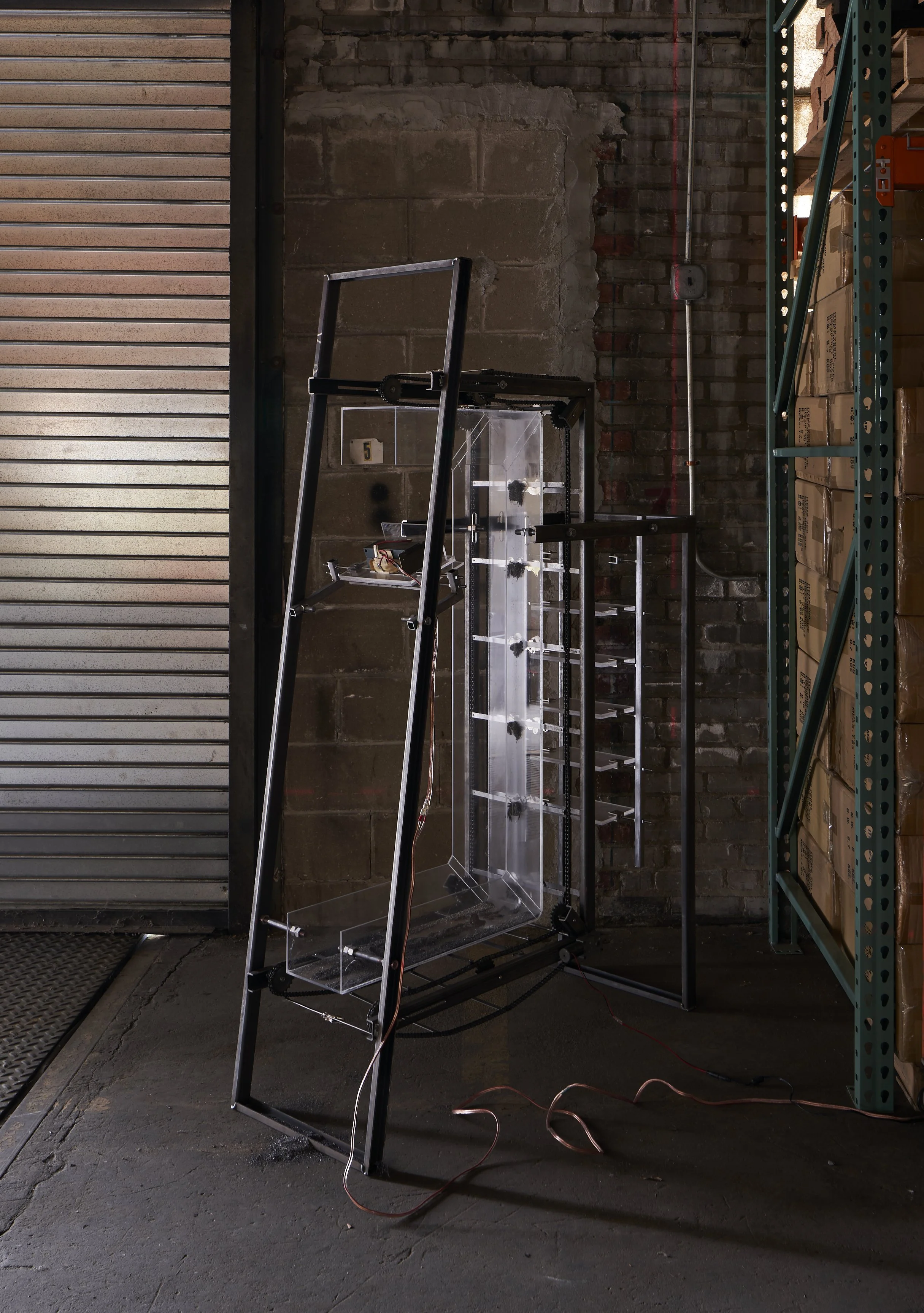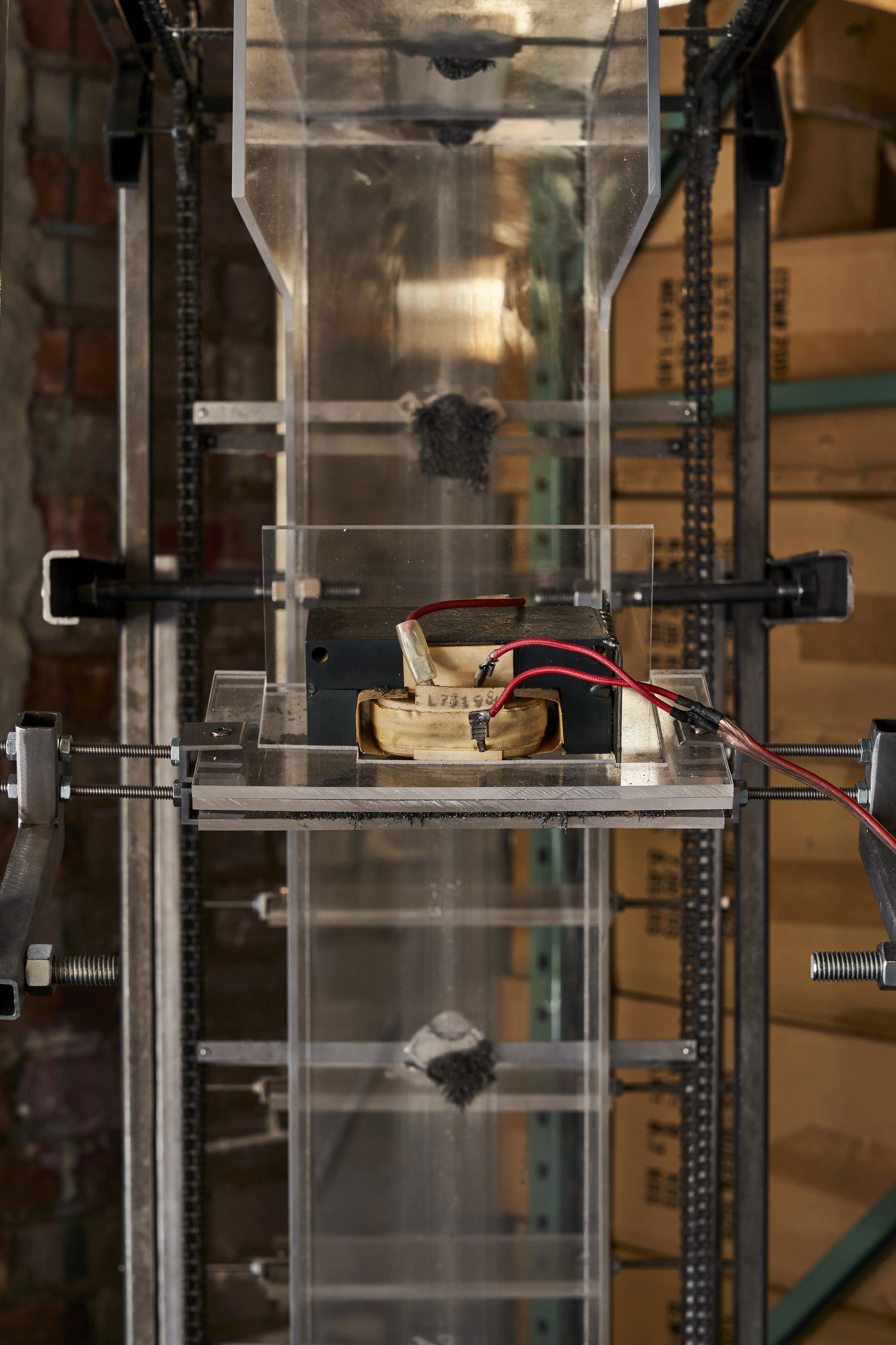 acrylic, steel, microwave transformer, roller chain, sprockets, motor, hard drive magnets, power supply